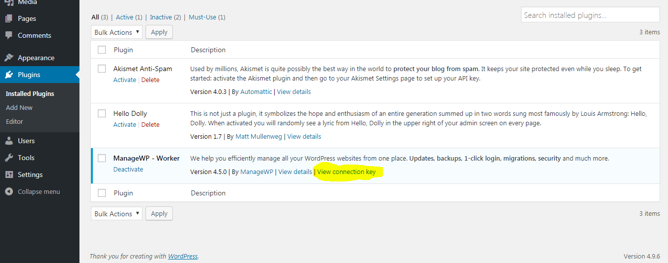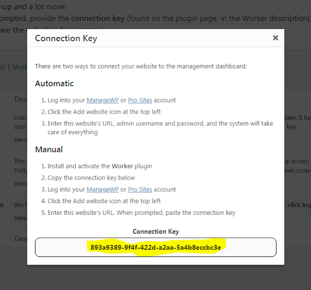 5. Aktifkan Plugin ManageWP Worker kemudian klik : View Connection Key