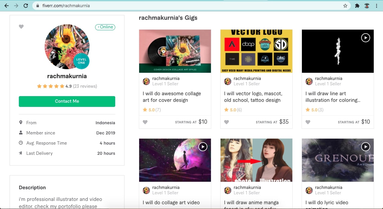 Oh iya, barangkali mau kepoin akun fiverr saya, bisa cek di akun Rachmakurnia atau kalau mau order desain maupun video di situ ya bisa banget. Saya sematkan screenshoot Gigs akun saya, barangkali kalian tertarik untuk order, atau tertarik untuk menggunakan jasa review akun fiverr ke saya.